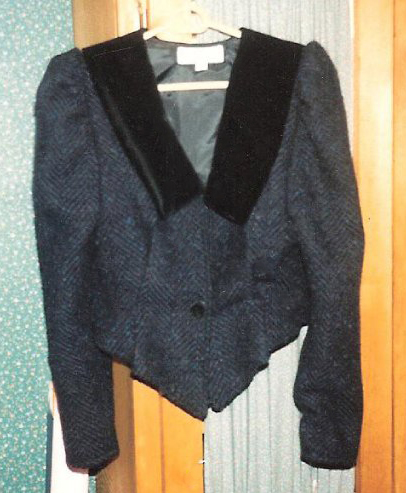 I designed this with leg of Mutton sleeves, a pleated body for shape and the Sailor Collar is velveteen. The design is awesome and makes everyone look very shapely. It is lined and has a one button closure.